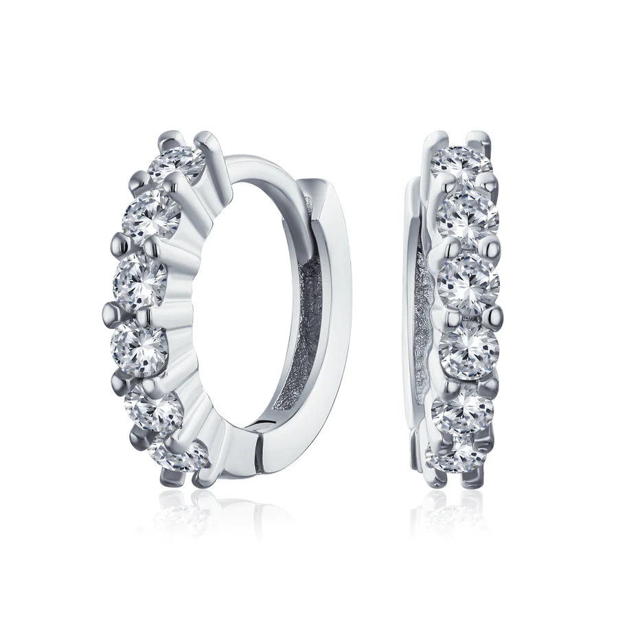 Sleek and chic, April babies will love our petite 11mm, sterling silver huggie hoops to enhance any ensemble. Featuring bursting CZ, these earrings are a great gift.