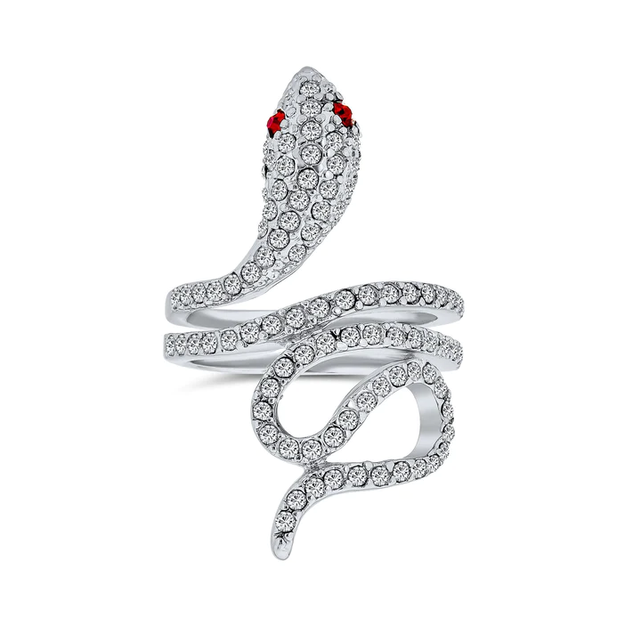 Add modern edge to any look with this 5mm, pave CZ, rhodium plated brass ring. With a wrapping snake pattern there’s a contemporary feel to this chic animal cocktail ring.