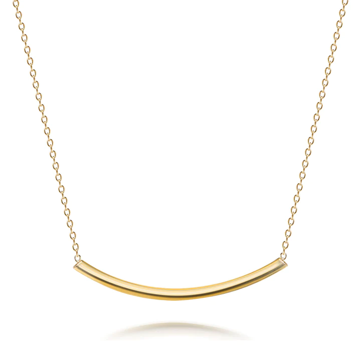 This modern curved bar necklace is great for layering and bringing some yellow gold plated elegance to your outfit. Lightweight on a 16 inch chain, spanning 1.5 inches this is the perfect eye catching accessory.